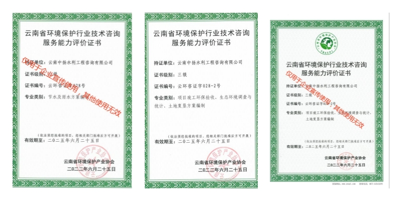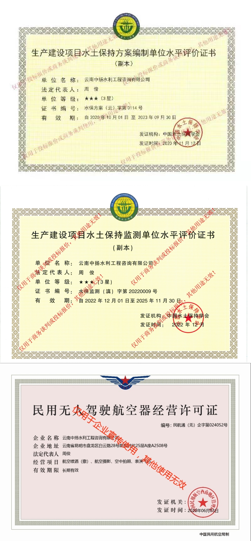 云南中揚水利工程咨詢有限公司成立于2011年,注冊資金100萬元整。公司從事的主要業(yè)務為生產建設項目水土保持咨詢設計(水保方案編制、水保監(jiān)測、技術評估及咨詢)、水土保持規(guī)劃、水利工程設計(農田水利、河道)、可行性研究報告編制、土地復墾等。公司已取得水土保持方案編制、水土保持監(jiān)測、工程咨詢備案、環(huán)境污染治理、環(huán)境保護行業(yè)技術咨詢服務能力評價證書、民用無人駕駛航空器經營許可證等資格證書,是云南省水土保持學會和云南省環(huán)境保護協會會員。