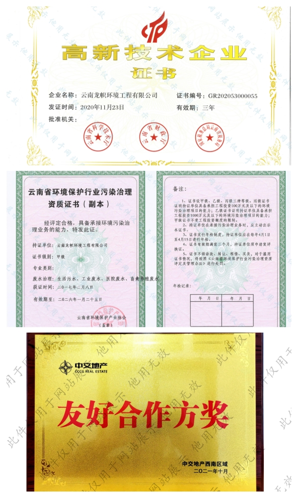 公司持有環(huán)保工程專業(yè)承包二級(jí)、市政公用工程總承包三級(jí)、建筑工程總承包三級(jí)、污染治理乙級(jí)、污染治理設(shè)施運(yùn)行服務(wù)二級(jí)資質(zhì)證書。前后獲得“十二五”生態(tài)文明建設(shè)突出貢獻(xiàn)單位、云南省省級(jí)成長(zhǎng)型中小企業(yè)、云南省知識(shí)產(chǎn)權(quán)優(yōu)勢(shì)企業(yè)、云南省科技型中小企業(yè)、云南省專精特新中小企業(yè)、招商蛇口最佳合作伙伴、中交置業(yè)友好合作方獎(jiǎng)等榮譽(yù)。